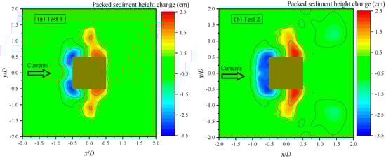 The ultimate topographies and photographs of the three tests are shown in Figure 9 and Figure 10. For the SC piles of tests 1 and 2, the scouring and deposit distributions were similar (Figure 9a,b). Maximum scour depths were seen at two upstream corners. The depositions were mainly at two mid-rear sides. Owing to the larger and wider extension of the concentrated streamlines for the higher SC pile (test 2), the scour holes sizes and the maximum deposition height were larger than that of test 1. The sediment deposition behind the SC pile in Figure 9a was found to be higher than that of Figure 9b. However, the same values of the maximum scour depths for tests 1 and 2 indicate that the amplified shear stress at the upstream corners was dependent on the pile cross-section rather than on the pile height. This conclusion is applicable for a pile width to flume width ratio that is smaller than 1/12.