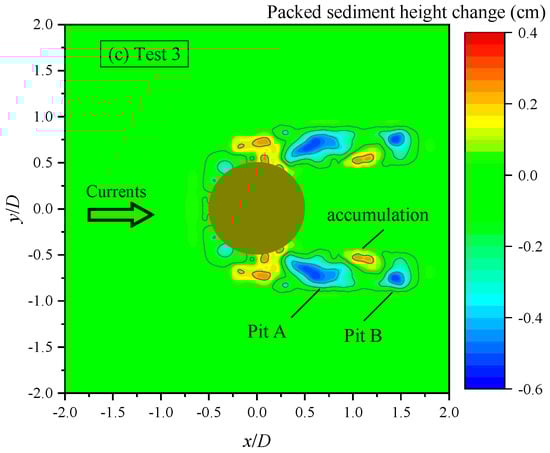 Contours of bed levels around the piles. (a) Test 1; (b)Test 2; (c) Test 3.