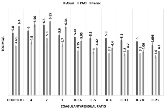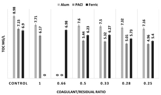 Percentage additional TOC removal for each C/R ratio tested was calculated as the percentage difference between the TOC concentration of effluent water using just the coagulant (no residual solids) and that of water treated with C/R ratios as shown in Equation (1).