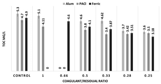 The data from the jar test shows that treatment with residual solids still was able to achieve additional TOC removal with respect to controls as shown in Figure 3. Although the effect of each coagulant by itself on the water seems different than that on surface water and so are the ratios, the percentage difference in TOC removal is on average over 17%. This can be clearly seen in the graph when the effluent TOC concentrations are compared to controls. Analysis of the data shows that a 14.1–38.2% additional TOC removal can be achieved with the selected ratios for alum, a 21.2–32.1% for PACl, and 6.3–42.6% for FeCl3 relative to the control. Average percent additional TOC removal for alum, PACl, and FeCl3 are 25.4%, 28.5%, and 24.6%, respectively, for all selected ratios.