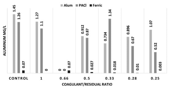 Aluminum concentrations of raw water differ depending on the source and so are the concentrations in effluent water depending on the treatment used. Using aluminum-based coagulants such as alum and PACl can also increase the concentrations of aluminum in the effluent water, so this was an area of concern during this study []. New treatment technologies that are aimed at improving water quality with respect to one contaminant or water quality parameter may sometimes degrade it with respect to another. Therefore, aluminum concentrations were tested before and after treating water with residual solids for all three coagulants used.