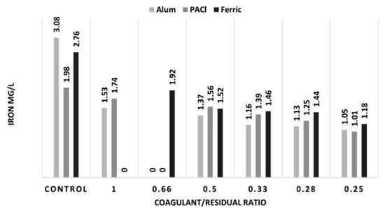 Most drinking water utilities have to deal with iron concentrations in their source water on a day-to-day basis. Presence of iron ions in natural and treated waters is known to have adverse effects on disinfection leading to increased formation of DBPs [,,]. With increasing drought conditions, changes in the land use, and decreasing dissolved oxygen concentrations in the water sources, iron concentrations in raw water is becoming a bigger problem []. Aeration is typically used to precipitate iron from the raw water entering a treatment plant, but usage of iron-based coagulants to decrease TOC concentrations can sometimes have an adverse effect with respect to iron residual concentrations in finished water. The proposed treatment using residual solids raises concerns of increased iron concentrations in the effluent water as one of the coagulants used is FeCl3. Therefore, iron concentrations were tested before and after treating water with residual solids for all three coagulants used.