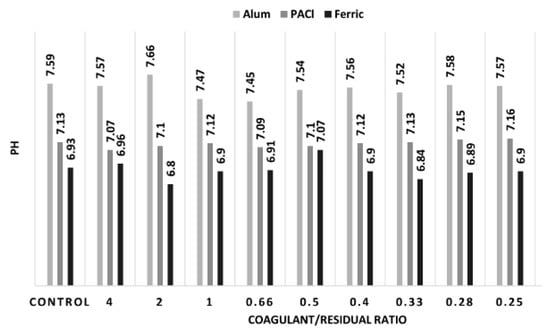 The drinking water treatment process is a pH-based system. pH differences can be the result of coagulants added as part of the treatment and they are usually adjusted by addition of a base or an acid before disinfection []. Different disinfectants work effectively at different pH ranges. For example, chlorine works well at lower pH (pH 6–7) when compared to chloramines (pH 7–8.5) []. Therefore, water utilities adjust their pH throughout the process to allow for different unit processes to work more efficiently. However, pH adjustment can sometimes be expensive or hard to achieve, and the expenses of which could negate the benefit from this process. Different coagulant usage results in different pH in the effluent water and this raises the concern about dramatic pH changes as a result of proposed treatment with residual solids []. Therefore, pH is measured before and after treating water with residuals for all three coagulants used for both surface and alluvial ground water and are compared against their respective controls as shown in Figure 6.