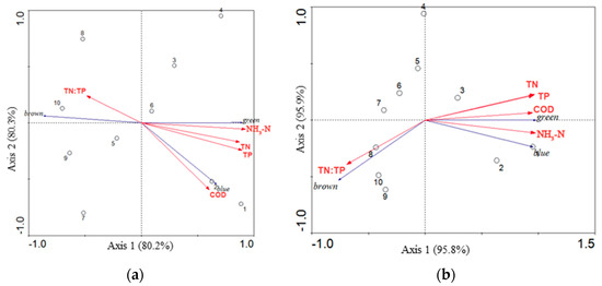 Redundancy analysis (RDA) diagram of phytoplankton groups (chlorophyll contents for blue, green and blown) and environmental parameters (total nitrogen (TN), NH3-N, total phosphorus (TP), chemical oxygen demand (COD) and N:P ratio) for tank A (a) and tank B (b).