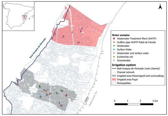 The population in the RAM always used the irrigation channels as a sewage system for waste-water. For this reason, reused untreated waste-water was done on a small scale without any treatment, comprising only urban waste-water of surrounding villages and the sparsely distributed houses in the rural area. This situation was critical after the 60 s when massive industrialization and use of chemical products in the houses produced quality problems in all the traditional irrigation systems in Valencia. During the 2004–2008 drought period, in a context of acute water shortage, the Water Authority (the Confederacion Hidrográfica del Júcar), promoted water reuse for irrigation as a measure to supplement river water and release pressure over existing water demand. Public funds, at that time, were devoted to building conveyance infrastructure from the Waste-Water Treatment Plants (WWTPs), to a point of discharge in the channel network. In that context, farmers accepted these additional water resources, introducing the use of treated waste-water in certain areas. However, although public authorities have been devoting efforts to disconnect the sewage and irrigation systems, some connections, mainly of sparsely distributed houses in the rural area or old houses inside the rural towns, still exist and seem to be a source of pathogens in irrigation water.