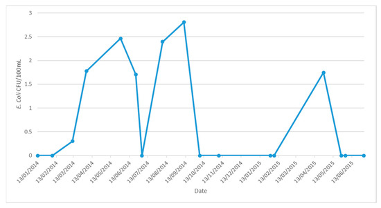 On the other hand, the WWTP performs regular analysis of E. coli at the outlet pipe. The results are shown in Figure 2. The increase of the bacteria CFU in our measurements (10 km away from the connection with the RAM’s principal channel) is about 4 log CFU. It can be explained by the connection of old houses in the town of Massamagrell or the spread country houses located near the fields, which can pollute the irrigation water with untreated spills.