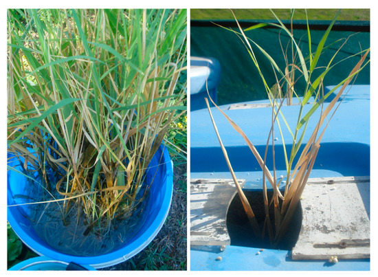 The giant reed (Arundo donax L.) has been proposed as a promising candidate for phytoremediation due to its favorable characteristics as a biomass crop [15,16,17,18,19]: rapid growth and high production of biomass; simple agronomic management and easy harvesting of biomass; good tolerance and ability to assimilate the metals, preferably in the aboveground biomass [20,21]. The present work aimed to evaluate the physiological response of Arundo in a semi-hydroponic growing system in on-field environmental conditions (mesocosm) contaminated with different concentrations of Cu (0, 150, and 300 ppm). In Italian areas where vineyards and orchards are largely diffused, the Cu concentration very often overcomes 200 mg kg−1 in the topsoil, exceeding the Italian threshold (120 mg kg−1) for residential/recreational use [1,22]. The concentrations tested in the present study are higher than these limits. Hence, the growth of the Arundo in a system where high amounts of Cu are freely available, allowed us to test its tolerance capacity and to understand how to use the species in such contaminated soils.
