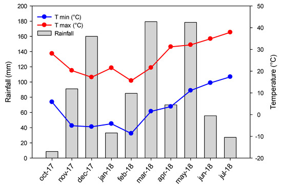 Four homogeneous Arundo cuttings (considered as replicates) per mesocosm were transplanted on October 2017 (Figure 2). The leaves of the plants were sprayed monthly from October to December with a foliar fertilizer (P-K 30–20, plus negligible amounts of microelements from 0.1 to 0.05%). The same fertilizer was dissolved also in the tank. In June, the developed plants underwent the treatment with copper sulfate penta-hydrated (Carlo Erba Reagent, CAS 7758-99-8S). We compared three concentrations: 0 (control), 150, and 300 ppm. Two mesocosms were chosen as controls, while the remaining two mesocosms were treated, respectively, with 150 and 300 ppm. The mesocosms were randomly assigned to different treatments. The morphological, nutritional, and physiological characterization of the plants took place at 7, 14, 21, and 28 days after the contamination. In Figure 3 the main meteorological variables of the period are shown.