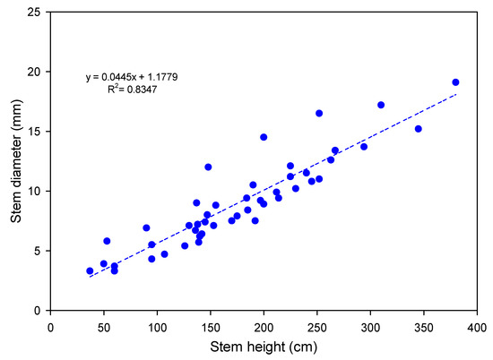 Regardless of the concentrations, a direct relation linked the stem height and the corresponding basal diameter (Figure 4). The result was in agreement with other observations [32] in the Italian environment.