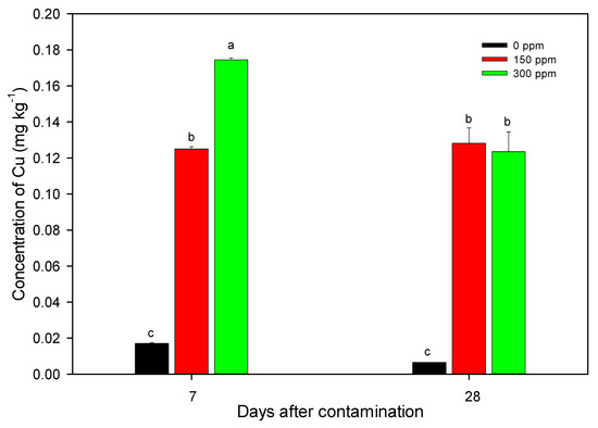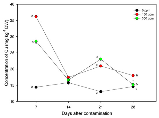Copper plays a role in plant physiology and at low levels, (3–20 mg kg−1 DW), is required for plant development [28,29]. It is a constituent of proteins and enzymes. These act in cell compartments like endoplasmic reticulum, mitochondria, and chloroplasts [30]. The copper supplied to the substrate favored the plant growth soon after treatment. In the present study, the height of the main stem was always higher in the treated plants than in the control. But, at each time interval, the difference was never significant (Table 2). The number of stems in plants grown on 300 ppm Cu was two-fold higher than in control plants one week after treatment (Table 2). This was the only case where the difference among treatments was significant. After 28 days, the gap between 300 ppm and the other two treatments diminished.