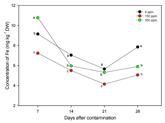 Time course of the iron concentration in the leaves of Arundo plants treated with different copper concentrations (0, 150, and 300 ppm) for 28 days. Data points and vertical bars represent means (n = 3) ± S.E., respectively (when not reported S.E. is smaller than symbol size). One-way ANOVA was applied and for a given duration different letters indicate significant difference according to Tukey test (p ≤ 0.01).