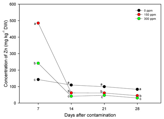 Time course of the zinc concentration in the leaves of Arundo plants treated with different copper concentrations (0, 150, and 300 ppm) for 28 days. Data points and vertical bars represent means (n = 3) ± S.E., respectively (when not reported S.E. is smaller than symbol size). One-way ANOVA was applied and for a given duration different letters indicate significant difference according to Tukey test (p ≤ 0.01).