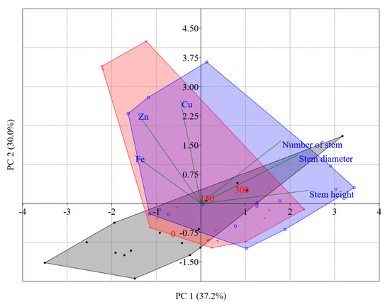 To better highlight the response at growth and nutritional level, a multivariate analysis was conducted (Figure 9). The PCA showed a clear differentiation between the Cu-treated and the control plants. The areas of the Cu treatments partially overlapped in the upper quadrants. Instead, the area of the control plants was in the opposite quadrants. The first component accounted for a large part of the morphological traits. These, in turn, were influenced by the highest Cu concentration (300 ppm). The second component was associated with microelement content. The Cu contamination caused differentiation of Cu, Fe, and Zn content in the treated plants, with a specific effect on the plants grown at 150 ppm Cu.