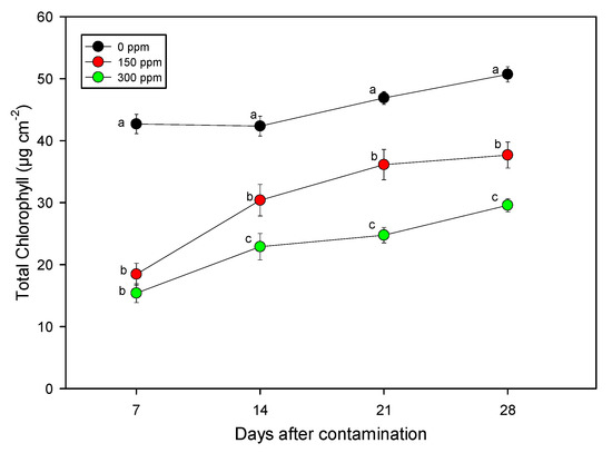Time course of the chlorophyll content in Arundo plants treated with different copper concentrations (0, 150, and 300 ppm) for 28 days. Data points and vertical bars represent means (n = 8) ± S.E., respectively. One-way ANOVA was applied and for a given duration different letters indicate significant difference according to LSD test (p ≤ 0.05).