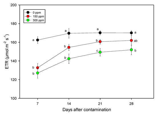 Time course of the electron transport rate (ETR) in Arundo plants treated with different copper concentrations (0, 150, and 300 ppm) for 28 days. Data of electron transport rate (ETR) measured at steady-state with a photosynthetic photon flux density (PPFD) of 1000 μmol m−2 s−1 is shown after 7, 14, 21, and 28 days after contamination. Data points and vertical bars represent means (n = 8) ± S.E., respectively. One-way ANOVA was applied and for a given duration different letters indicate significant difference according to LSD test (p ≤ 0.05).