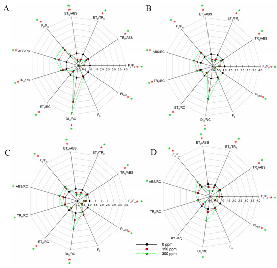 Changes in the shape of the radar plot JIP-test parameters induced by different copper concentrations applied to Arundo plants and measured after 7 (A), 14 (B), 21, (C) and 28 (D) days of treatment. The data are the average of eight replicates and report the values with respect to plants grown in the absence of contamination (control = 1). Red and green asterisks indicate significant differences (LSD test, p ≤ 0.05) between control plants (0 ppm) and those exposed to 150 or 300 ppm copper, respectively.