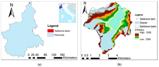This paper focuses on the Sabbione catchment, located in Val d’Ossola, in the northern part of Piedmont region of Italy (see Figure 1a). The main feature of this catchment along with the hydropower plant considered as the closing section is presented in Table 3. The delimitation of the catchment was done considering the Sabbione dam (Morasco hydropower plant) as closure. This catchment has altitude range between 2460–3358 m above sea level (m.a.s.l), comprising four glaciers that cover approximately the 30% of the whole area of the catchment [64]. Recent work by Giaccone et al. [84] observes a glacier retreat in this catchment of 2 km in the time interval 1885–2011.