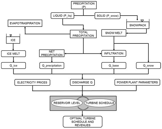 We used a semi-distributed hydrological model following Bongio et al. [25], Patro et al. [18], and Ranzani et al. [59]. The basin was subdivided into independent sub-domain elevation bands with homogeneous geomorphological characteristics. The model simulates the average daily discharge flowing to the closing section, i.e., the Sabbione hydropower plant, from the topographic information, the local precipitation, and temperature data series. The total discharge is calculated as the sum of four distinct contributions: snow melt, glacial melt, rainfall runoff, and base/groundwater flow. The nivometer and the rain gauge approach [85] separate solid from liquid precipitation, while the degree-day model [86,87] treated snow and glacier melt. The mass balance of the glaciers was calculated at yearly scale considering mass-conservation law and neglecting any motion associated. We computed evapotranspiration with a long-term average temperature criterion [88,89], and effective net precipitation and infiltration with the Curve Number method [90]. Finally, a Nash approach computes all the components at the closing section [91]. A schematic representation of the model can be seen in Figure 2.