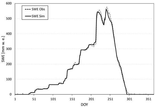 The values obtained from this phase were DDFMAX = 1.77 mm/d °C and DDFMIN = 0.99 mm/d °C. Figure 3 compares the simulated and observed SWE for the best year of calibration (2001–2002).