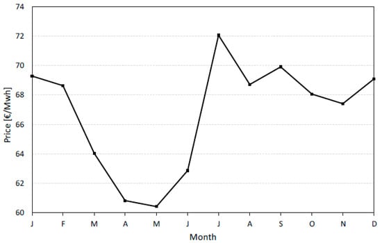 The high uncertainty of long-term electricity price projections determined the necessity of introducing a specific approach. Five electricity price scenarios were taken from Gaudard et al. [26]. Figure 4 shows the average monthly electricity spot price series for Italy (1 January 2005–31 December 2016), taken from Energy Markets Manager (Gestore dei Mercati Energetici, in Italian, see http://www.mercatoelettrico.org/). It shows a double peak, one in winter (heating systems) and the other in summer (cooling system).