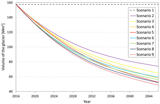The rate of glacier retreat is not constant. Until 2030, volumes reduce of almost 50% irrespective of the climate scenario considered. This fast decrease is due to the melting of low altitude glaciers (under 3000 m.a.s.l.), which are more vulnerable to temperature increases [18]. Then, the reduction slows down to reach a new pseudo equilibrium condition. Note that the glacier’s mass balance model neglects the dynamic mobility i.e., the transfer of the upper glacier’s mass to lower one. This could reduce the decrease of volume at lower altitudes and increase the reduction at higher ones [19]. Figure 5 also shows that the glacier’s volume reduces significantly in liquid only precipitation scenarios (6–9) due to the absence of snow that no longer fuels the glacier. The modifications in the hydrological regime play a relevant role in glacier retreat.