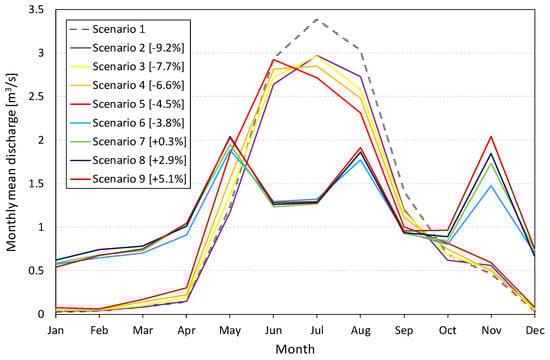 Figure 5 and Figure 6 combined show the glaciers depletion predominance towards the discharge. The decreasing rate of discharge is higher for climate scenario 2 and progressively reduces as higher trends in temperature (climate scenarios 3–5) are implemented, something that occurs also for climate scenarios 6–9. In fact, the greater temperatures induce a faster regression of the glacier, thus increasing runoff. This compensation would continue until the volume of the glacier is enough to balance the losses due to higher temperatures. The results also reflected those found by Ravazzani et al. [11] on the Toce river basin, which comprises our study area, and differ slightly in the percentages of variation of monthly mean discharge. Ravazzani et al. [11] observed a seasonal shift in monthly discharge with a significant increase in the winter period, while the monthly discharge decreases in summer for the simulation period 2011–2050.