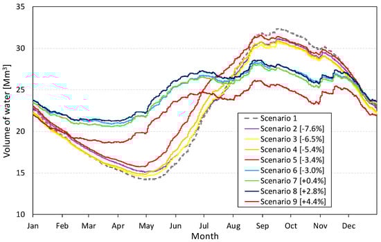 Evolution of the reservoir’s volumes for the nine climate scenarios at 2030.The mean income variation w.r.t to base climate scenario 1 are provided in the brackets, with a 95% confidence interval.