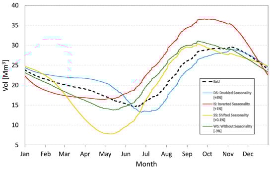 We now analyze the impact of the five different electricity price scenarios. We consider the business-like-present hydrological scenario (climate scenario 1) to focus on the impact of the seasonality of the electric demand. Figure 8 shows the evolution of reservoir’s volumes according to the five price scenarios.