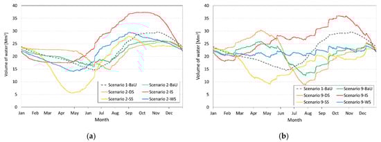 Evolution of the reservoir’s volumes with a 95% confidence interval at 2030 for mixed scenarios. (a) Climate scenario 2 with all price scenarios and (b) climate scenario 9 with all price scenarios.
