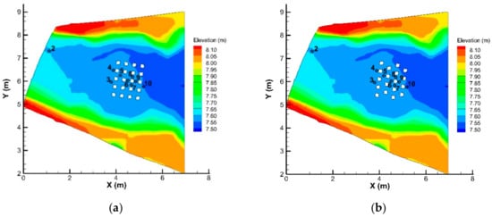 Herein, the aligned and staggered building layouts in the original topographic configurations were implemented with low inflow discharge (see Figure 2c).