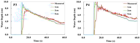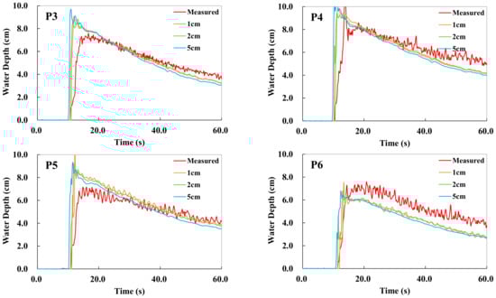 Results of the model predictions at the 1, 2, and 5 cm grid resolutions and laboratory measurements are shown in Figure 6 and Figure 7. According to the graphs shown in Figure 6 and Figure 7, the water depth results for the 5 cm grid model are larger than those for the other grid model resolutions, with the peak depth values showing the same trend. However, there are some exceptions, for example, the depth results at gauges P5 and P6 in the staggered layout with a 5 cm mesh resolution are lower than those of the other model results and have the lowest peak depth values. The depth results for the 1 cm grid resolution are slightly lower than those for the 2 cm grid resolution. Additionally, more obvious data oscillation can be observed in the 1 cm resolution results, particularly at gauges P9 and P10, which demonstrate partly that model performance for the 1 cm mesh resolution is more accurate.