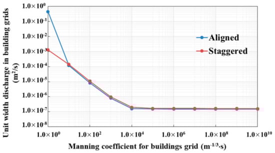The Manning coefficient is an empirical coefficient that estimates the average flow velocity, which crucially affects numerical models [29]. In the BR method, several similar numerical models were established using different Manning coefficients for building grids to assess the coefficient’s sensitivity. The indicators used for model performance were unit-width discharge in the building grids and water depth, which could appropriately reflect the resistance effect of buildings (see Figure 8). The unit-width discharge in the building grids indicates the amount of flood flow through the building grids across a unit-width. The water depth is the depth recorded at a point with an x-coordinate of 4.65 and y-coordinate of 6.02 (located in the building grids). The Manning coefficients were 100–1010 . Figure 8 shows the results: when the Manning coefficient is less than 104 , the unit-width discharge and water depth in the building grids decreases as the Manning coefficient increases. In contrast, when the Manning coefficient is 104–1010 , the unit-width discharge and water depth in the building grids have almost no discharge, and the trend of the unit-width discharge and water depth in building grids has no change. Therefore, the unit-width discharge and water depth in the building grids are only slightly sensitive when the Manning coefficient is greater than 104 . However, even when the Manning coefficient was assigned a very high value, model performance was not significantly improved. Therefore the Manning coefficient for building grids is set to 104 in the BR method.
