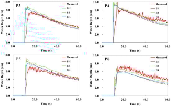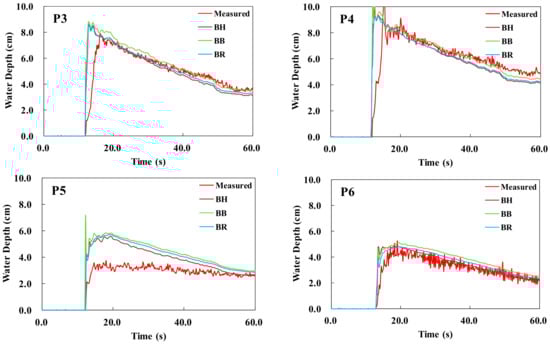 Table 6 show that the average NSEs of the three methods exhibit different trends in the aligned case: the value of the BR method is highest and that of the BB method is lowest. However, in the staggered case, the value of the method BR is highest and that of the BH method is lowest. Table 6 also shows that the NSEs of gauge P5 in the aligned case and those of gauge P8 in the staggered case are lower than the average NSEs; their poor performances are shown in Figure 9 and Figure 10. In general, the average NSEs of all scenarios are greater than 0.65, indicating that TELEMAC-2D with the three building representations is sufficiently accurate for urban flood simulations.