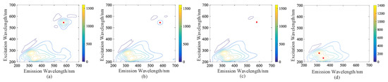 Figure 2, Figure 3 and Figure 4 show the 3D fluorescence spectra of salicylic acid, rhodamine B, and phenol drinking water solutions, respectively, at 40, 10, and 4 μg/L. At 40 μg/L, the 3D fluorescence spectra of the three pollutants had obvious fingerprint characteristics. Small red dots in figures are used to point out the peaks. Salicylic acid had three characteristic peaks. One characteristic peak was observed at 290–300/400–410 nm in excitation band/emission band, whereas the other two overlap with that of drinking water, which was caused by the superposition of fluorescence spectra. The characteristic peak of rhodamine B was observed at 555/570–580 nm in excitation band/emission band, and that of phenol was observed at 270–280/305–315 nm in excitation band/emission band, which overlapped with that of drinking water. With a decreased concentration of the three pollutants, the fluorescence intensity of their characteristic peaks decreased. Texture, characteristic peak position, and characteristic peak intensity can be used to measure the similarity of the fluorescence spectroscopy. At 4 μg/L, the 3D fluorescence spectrum of the polluted drinking water solution was close to that of drinking water itself. Therefore, for an online monitoring system of drinking water, effective methods of feature extraction and abnormal detection methods are very important to detect organic pollutants.