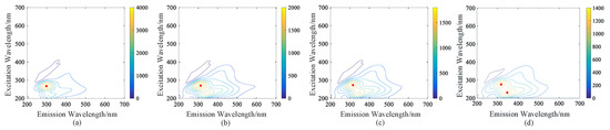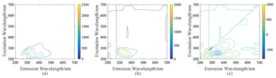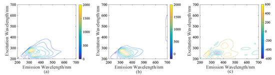 where is the number of components. For background drinking water, its 3D fluorescence spectrum has two distinct characteristic peaks, so the number of components is 2. is the element in the relative concentration matrix , indicating the relative concentration of the th component. is the element in the relative excitation matrix . is the element in the relative emission matrix . is the element in the 3D residual matrix . Substituting , and EEM matrix of the sample under test into Formula (5), the estimated relative concentration matrix of each component of the sample under test was obtained. Substituting into Formula (1), the estimated value of the 3D fluorescence spectral matrix of the sample under test was . can be represented by comparing the estimated value and the measured value is: