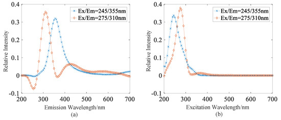 The drinking water samples of groups A and B were decomposed with ATLD to obtain relative excitation matrix , relative emission matrix , and relative concentration matrix . Considering that the 3D fluorescence spectrum of drinking water contains two characteristic peaks, the number of factors set in the algorithm was two. The relative excitation matrix and relative emission matrix of different factors are shown in Figure 6.
