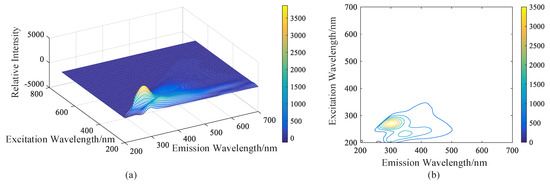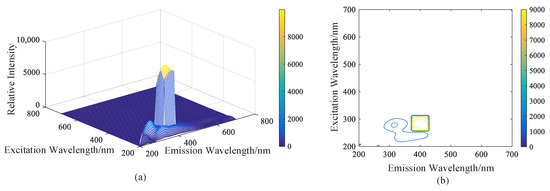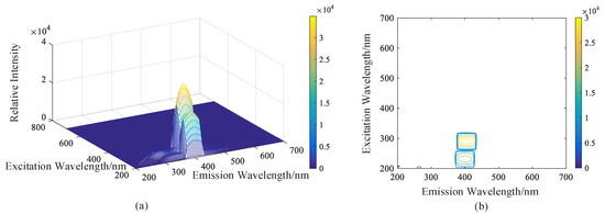 Many researchers have proposed many kinds of methods to detect water quality information because water quality has been increasingly paid attention by the world, and the detection technology becomes more urgently needed. Chemical analysis [3], gas chromatography (GC) [4], high-performance liquid chromatography (HPLC) [5,6], and gas chromatography-mass spectroscopy (GC/MS) [7] are common methods for water-quality detection, although they are complex and time-consuming. The concentration of pollutants is generally low after contaminant intrusion takes place in urban water supply systems, and according to the Environmental Health Criteria-EHC 161 [8] and the ‘Guidelines for drinking water quality standards in developing countries’ [9], the concentration limit of most organic pollutants is below 10 μg/L. Therefore, it is important to develop a detection technology for organic pollutants in drinking water with highly effective detection ability, so that pollution events can be detected in a timely manner and the pollutant can be accurately identified. Spectral analysis—as a new detection method without sample extraction, enrichment, other pretreatments, and chemical reagent addition—is gaining increased attention in the field of water-quality detection [10]. Common spectral analysis methods include UV-Vis and fluorescence spectroscopy [11,12,13,14,15]. UV-Vis detection has a certain boundedness in terms of sensitivity and detection limit. By contrast, 3D fluorescence spectroscopy can play an important role in the detection and analysis of organic pollutants in drinking water because it has multiple advantages such as high comprehensive characterization and abundant fluorescence information, high sensitivity, fast detection speed, and good selectivity.
