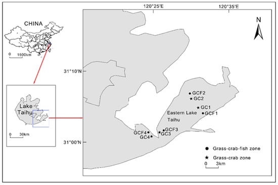 Location map of sampling sites in Eastern Lake Taihu. GC, grass-crab zone; GCF, grass-crab-fish zone.