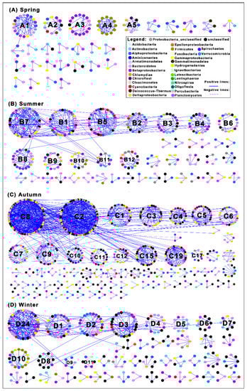 Species-species association network divided by modules for the spring (A), summer (B), autumn (C) and winter (D) bacterial communities. Only correlations between species that were statistically significant (p < 0.001) and strong (r > 0.9 or r < −0.9) are shown by the solid blue lines (positive correlations) and dotted pink lines (negative correlations), respectively. Correlations solely between pairs of operating taxonomic units (OTUs) are not shown. Different bacterial phyla/classes are represented by different colors, and the number on each node refers to the ID number of each OTU.