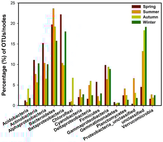 The percentage (%) of OTUs/nodes in each phylum/subphylum in the four seasonal networks of bacterial communities. Only phyla/classes that appeared in four seasonal species-species association networks are presented.