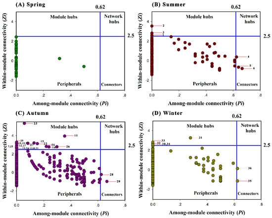 Zi-Pi plot showing the distribution of OTUs based on their topological roles. Each symbol represents an OTU in the spring (A), summer (B), autumn (C) or winter (D) bacterial group. The topological role of each OTU was determined according to the scatterplot of within-module connectivity (Zi) and among-module connectivity (Pi).