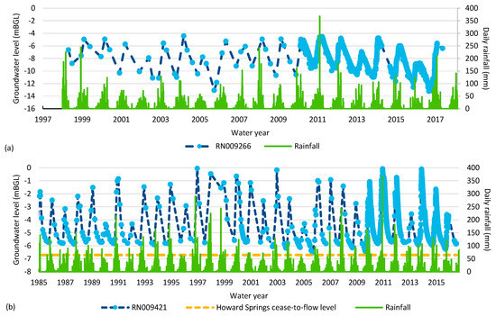Hydrographs of bores in the Darwin rural area: (a) RN009266 at Middle Point and (b) RN009421 at Howard Springs.