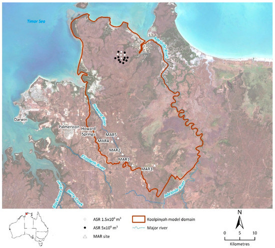 - Vanderzalm, J.; Page, D.; Gonzalez, D.; Barry, K.; Dillon, P.; Taylor, A.; Dawes, W.; Cui, T.; Knapton, A. Assessment of Managed Aquifer Recharge (MAR) Opportunities in the Fitzroy, Darwin and Mitchell Catchments; A Technical Report to the Australian Government from the CSIRO Northern Australia Water Resource Assessment, Part of the National Water Infrastructure Development Fund: Water Resource Assessments; CSIRO: Canberra, Australia, 2018. [Google Scholar]