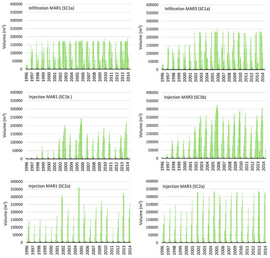 Comparison of monthly modelled recharge volume under infiltration (SC1a) or injection (SC1b, SC2a) type MAR scenarios: SC1a and SC1 b recharge occurs during mid-dry season, recharge triggered by dry season minimum hydraulic head of MAR1~18 mAHD, MAR3~10 mAHD. SC2a recharge occurs early dry season, constant head maintained from 1 April to 1 July, MAR1 constant head of 36 mAHD, MAR3 constant head of 20 m AHD.