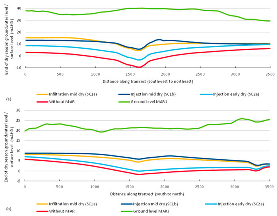 Example cross-section of hydraulic head response under infiltration (SC1a) or injection (SC1b, SC2a) type MAR scenarios at (a) MAR1 and (b) MAR3 for end of dry season groundwater level (30 November 2009). SC1a and SC1b Recharge occurs during the mid-dry season, recharge triggered by dry season minimum groundwater level of MAR1~18 mAHD, MAR3~10 mAHD. SC2a Recharge occurs in the early dry season, with constant groundwater level maintained from 1 April to 1 July, MAR1 constant head of 36 mAHD, MAR3 constant head of 20 mAHD. Location of the cross-section is shown on Figure 5.