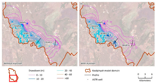 Hydraulic head response to an ASTR (injection well) MAR scheme (SC1b) triggered by declining hydraulic heads. Recharge is typically triggered between August and December. (a) The base case without MAR and (b) with the effect with MAR.