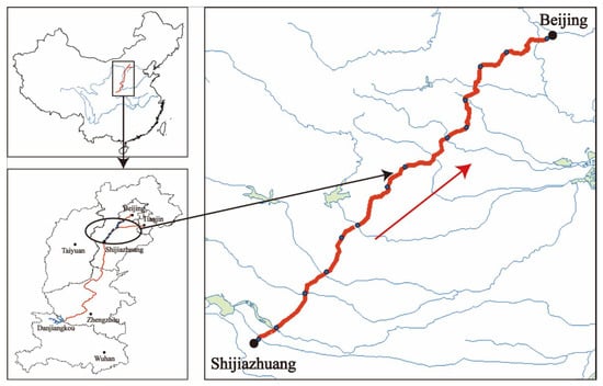 This study considers the Beijing–Shijiazhuang section, which covers the last 13 pools of the MRP. The study area is located in Hebei Province. The starting point of this canal system is near Shijiazhuang City and the end point is near Beijing City (see Figure 1). The study area is regarded as an independent canal system and the flow is non-pressure flow. The reason for choosing this area is that a practical control algorithm for these 13 canal pools is expected to be practical for all pools of the MRP, and the length of the canal pool changes from 10 km to 27 km, so the characteristics of this canal pool cover almost all of those observed on the MRP. The total length of the canal pools in the study area is 227.3 km. There are 11 offtakes and 7 escape gates, some of which are also used as offtakes. The initial flow condition of the canal system is set to be 70% of the design flow, which is the common flow condition. To simplify the description, it is assumed that there is only one offtake in each canal pool. During normal operation, the water level at the control point must not exceed its allowable water level range. It is assumed that the allowable water level range is no more than 0.35 m outside the designed water level bounds. Initially, the water levels at the control points are at the designed target water levels. The downstream and upstream boundaries are set as water level boundaries with a constant water depth of 3 m and 6 m, respectively. The basic parameters and initial flow conditions of the 13 pools are presented in Table 1.