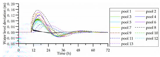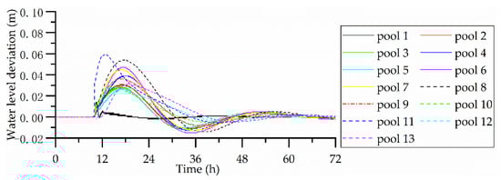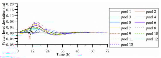 The critical water depths of the 13 pools at the initial condition are roughly 1.9, 1.4, 1.4, 1.4, 1.6, 1.3, 1.2, 1.2, 1.1, 1.2, 1.4, 1.3, and 1.3 m, respectively, which are considerably smaller than the target water depths, the smallest of which is 3.95 m. In Figure 3, Figure 5, Figure 7 and Figure 9, however, the maximum water deviation from the target water depth is about 0.5 m. Therefore, it can be deduced that there is no occurrence of a critical flow in all four scenarios.