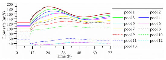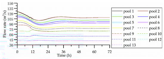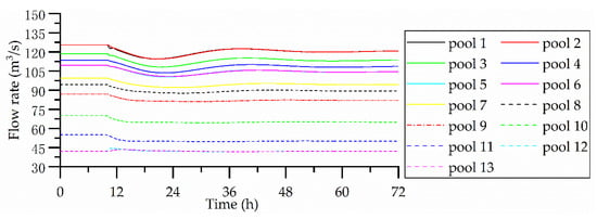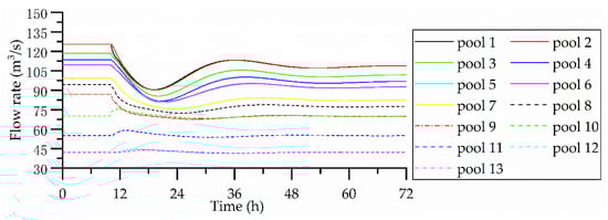 Figure 8 and Figure 9 show the control results for scenario 4. As can be seen from Figure 8, following this large disturbance, the water level changes are particularly large. The greatest water level deviation is 0.37 m in pool 7, which exceeds the allowable range of water level deviation. As the water level constraint is treated as a flexible constraint in the MPC, it is not guaranteed that the water level will not exceed the allowable range when the flow rate varies significantly. Compared with the water level changes in scenarios 1 and 3, scenario 4 exhibits a somewhat different shape and a prolonged stabilization time. At the end of the calculation (72 h), the canal system had not been stabilized. Under the flexible constraints mentioned above, the weight of the water level deviation will increase when the water level deviation is too large, making the control action more intense than before and changing the trend of the water level change. However, as the characteristic parameters in the control model are obtained based on the water surface of the pools under the initial flow rate, the actual characteristics of the pools will deviate from the characteristic parameters in the control model once the flow rate changes. In the case of particularly large flow changes, the deviation between the actual characteristics of the pools and the characteristic parameters of the control model will be more pronounced, which will lead to some degradation in the control effect. However, the water level deviations of the pools gradually decrease, indicating that the canal system is stabilizing.