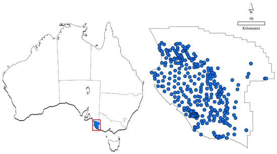 The development of the groundwater recharge data used in the paper was fully described by Crosbie et al. [] and has been already applied in a few studies, such as [,]. It includes recharge data from 465 groundwater bores, mostly located in South Australia with the remaining few in Victoria. Figure 1 shows the location of the study area in Australia and the spatial distributions of the 465 bores. The length of the time series on groundwater recharge varies from 3 to 41 years, based on the length of the groundwater observation records. The dataset is suitable for regional long term average study on groundwater recharge, because more than 70% of bores have an observation record of more than 15 years, and these bores are distributed throughout the study area. The atmospheric demand variables and groundwater extraction dataset were also used for predicting groundwater recharge.